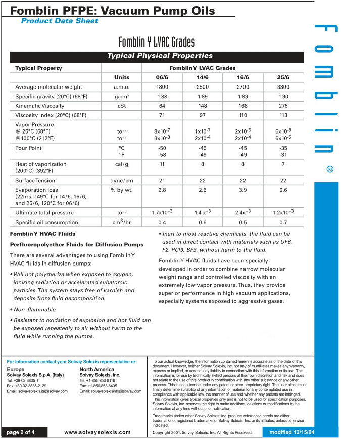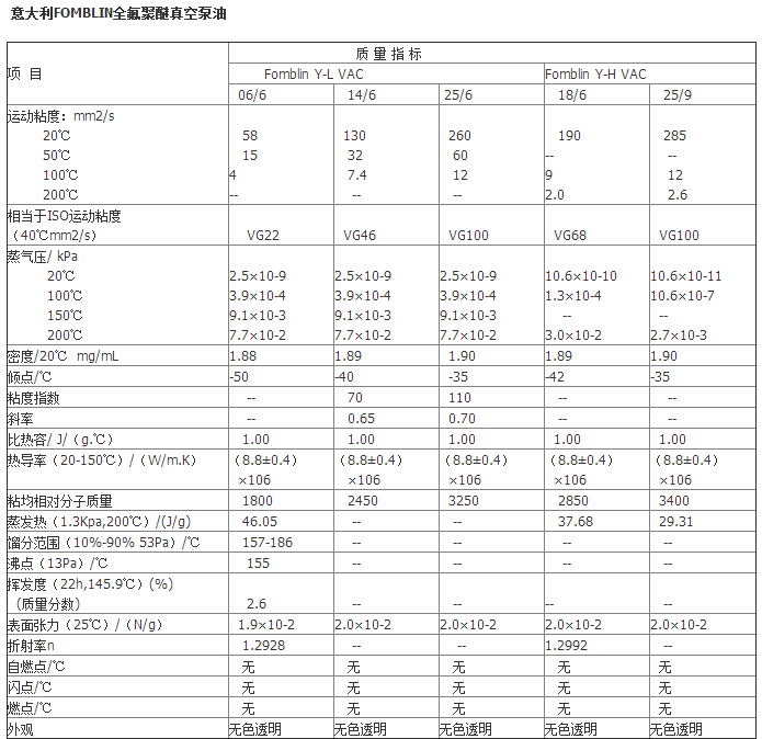 Fomblin Y 等級的全氟聚醚液主要是用作真空泵的潤滑劑。全氟聚醚液是氟*********的混合體。氟*********是在***************下提取的,最早的狀態是************。因為Fomblin的************元素只包括碳、氟、和氧原子,所以這些全氟聚醚液產品具有一些額外的特性: